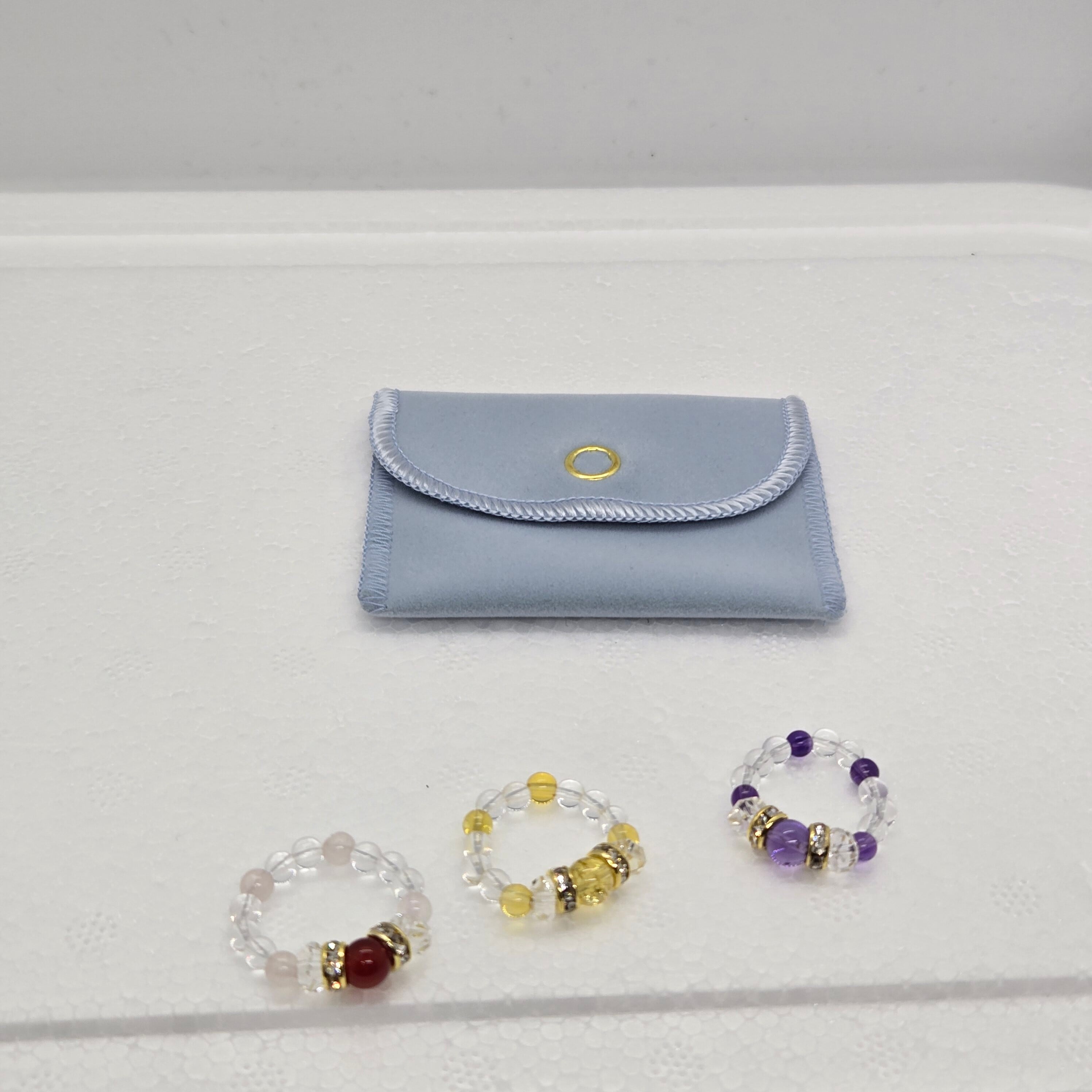 [赤メノウ×ローズクォーツ×白水晶]白水晶8個(4mm珠)、2個(6×3mm/カット)、赤メノウ1個(6mm珠)、ローズクォーツ4個(4mm珠)、ロンデル2個(6×3mm 真鍮/ラインストーン)[黄水晶×白水晶]白水晶8個(4mm珠)、2個(6×3mm/カット)、黄水晶4個(4mm珠)、爆裂黄水晶1個(6mm珠)、ロンデル2個(6×3mm 真鍮/ラインストーン)[アメジスト×白水晶]白水晶8個(4mm珠)、2個(6×3mm/カット)、アメジスト1個(6mm珠)、4個(4mm珠)、ロンデル2個(6×3mm 真鍮/ラインストーン)[サイズ]#8-#15[重量]各約2.5g[中糸]ポリウレタンゴム[付属品]専用ポーチ[個装サイズ]縦12.0×横7.0×高さ1.5(cm)/12.5(g)