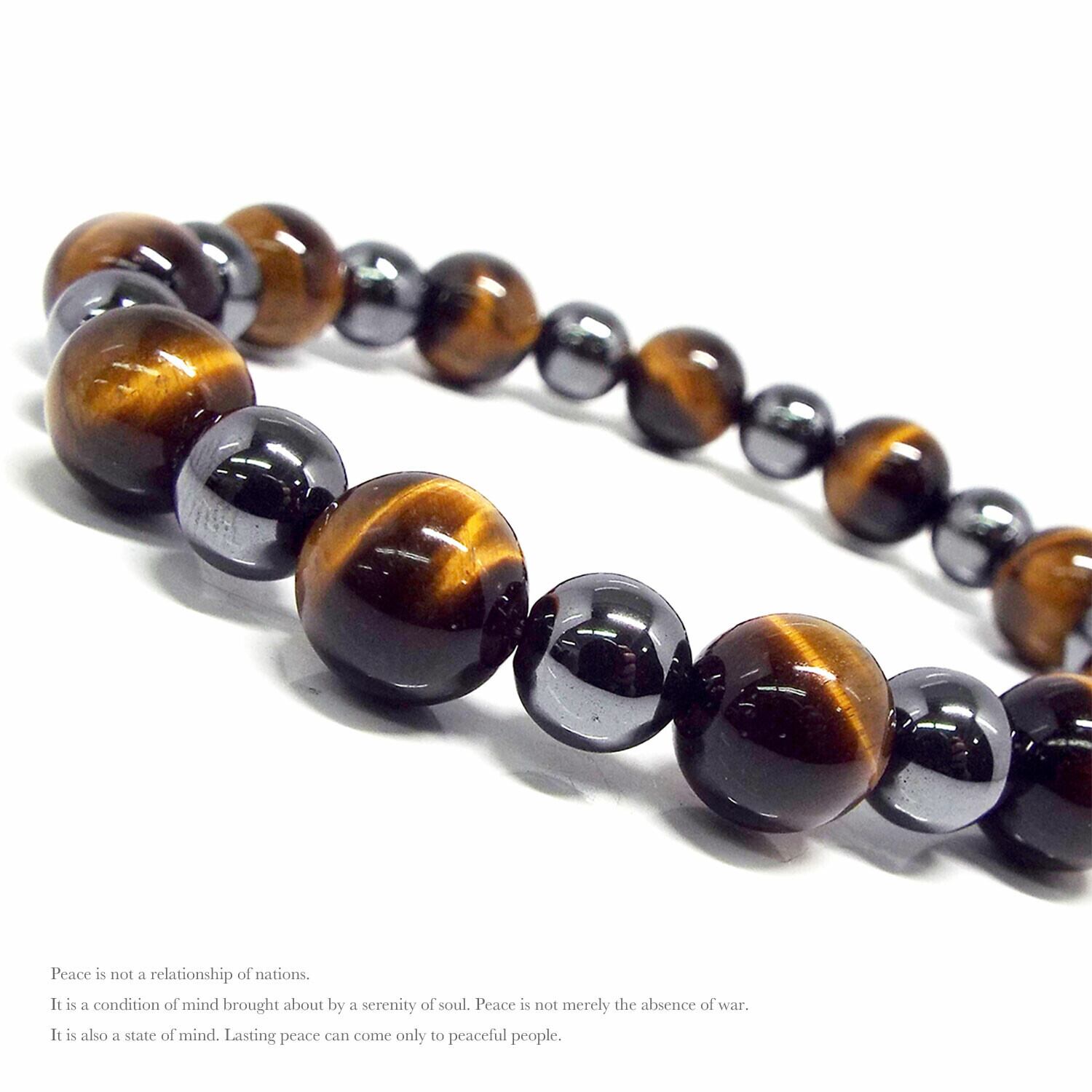 勝利に導くとされる「ヘマタイト」と金運アップの「アイガーアイ」 この二つの天然石のパワーが手に入る贅沢なブレスレット♪ タイガーアイとヘマタイトの組み合わせはビジネスチャンスを呼び寄せ成功をおさめるサポートをする効果があるといいます。 仕事運や金運を高めるタイガーアイと願望を実現する無限の可能性を秘めた天眼石の相性です。 持ち主に自信と実行力をもたらして物事の成功と導いてくれるでしょう。