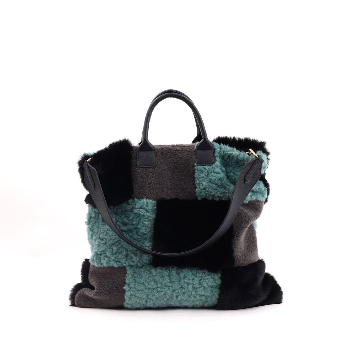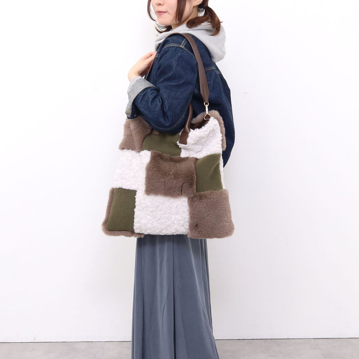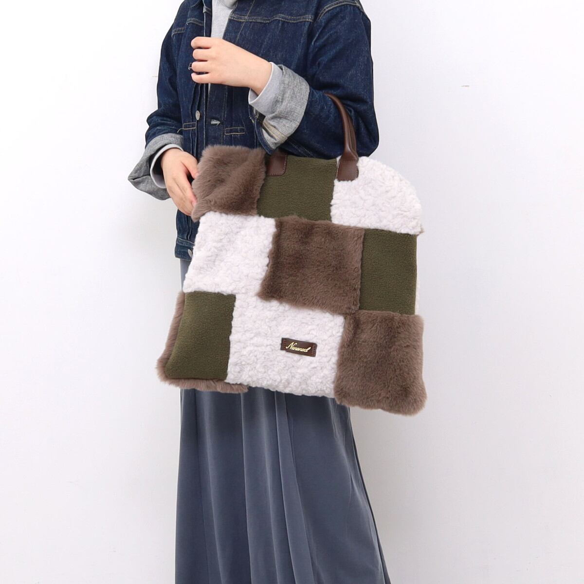 3種類のファーをパッチワークした大人っぽいデザインのトートバッグ。