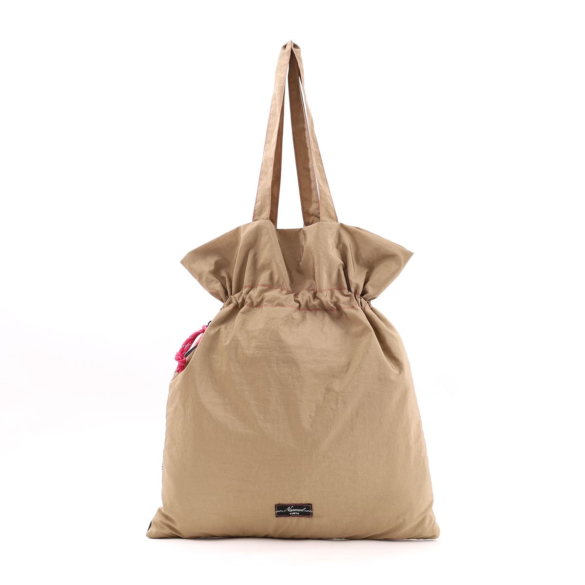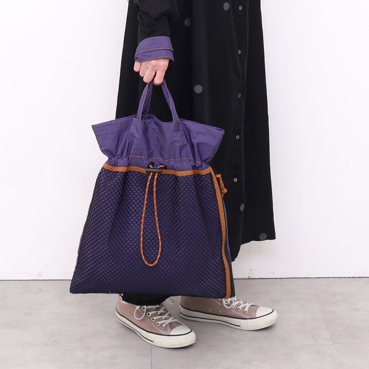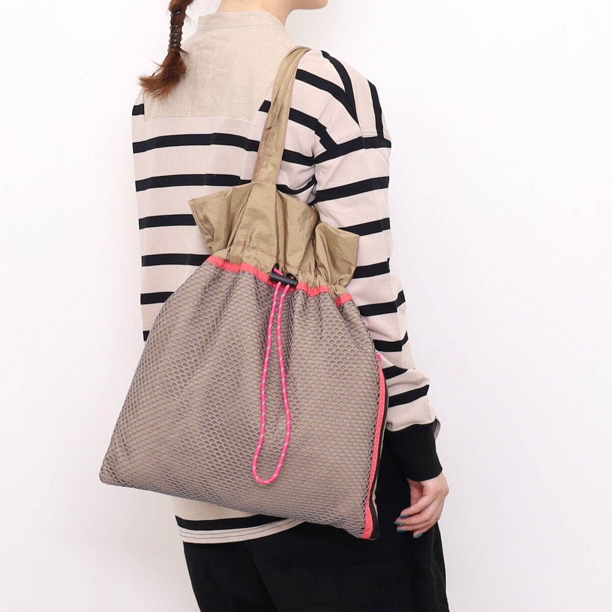 ポイントカラーのパイピングがアクセントになった巾着トートバッグ。